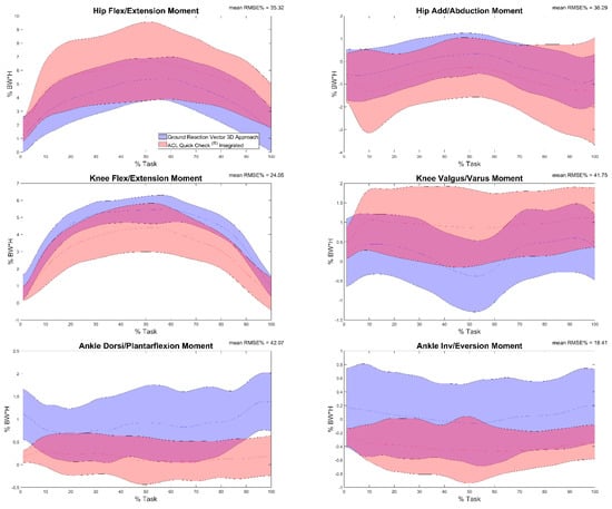 Hip, knee and ankle adduction/abduction and flexion/extension moments during the task calculated through the Ground Reaction Vector 3D approach (blue) and through ACL Quick Check® integrated (red) and mean of RMSE% of the comparison between the two. Averages plus and minus one standard deviation are reported as colored bands.