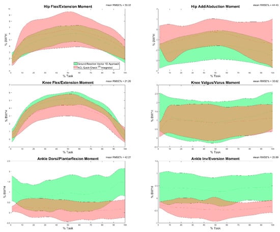 Hip, knee and ankle adduction/abduction and flexion/extension moments during the task calculated through moment arm 1D approach (green) and through ACL Quick Check® integrated (red) and mean of RMSE% of the comparison between the two. Averages plus and minus one standard deviation are reported as colored bands.