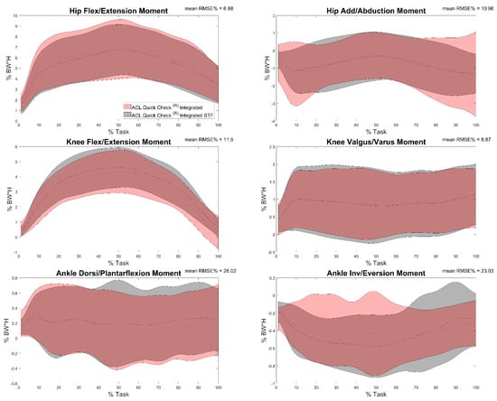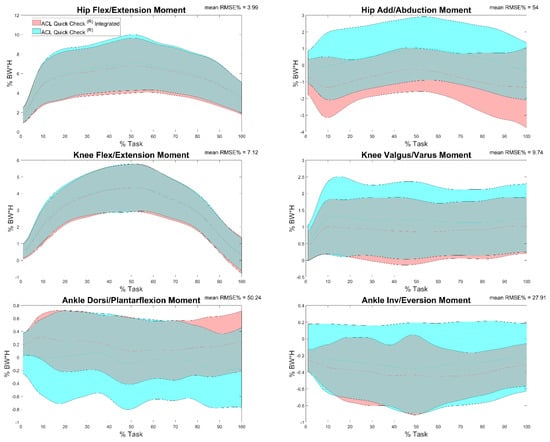 Hip, knee and ankle adduction/abduction and flexion/extension moments during the task calculated through ACL Quick Check® (cyan) and through ACL Quick Check® integrated (red) and mean of RMSE% of the comparison between the two. Averages plus and minus one standard deviation are reported as colored bands.