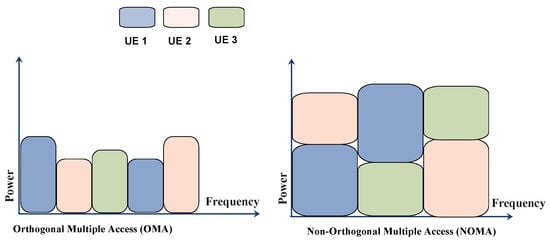- NOMA is different than all the previous orthogonal access techniques such as TDMA, FDMA and CDMA. In NOMA, multiple users work simultaneously in the same band with different power levels. As shown in Figure 3.