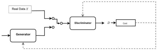 In a GAN, as shown in Figure 1, a generator and a discriminator are associated with an independent loss function. The generator and discriminator train completely unsupervised by the process and output sample sets due to the loss functions []. The dual loss functions accommodate the sought-after unsupervised learning capabilities within the GAN, but the functions produce costs in training []. The discriminator cost is that of identification of real samples as real and the correct identification of generated samples as generated with L as the loss function.