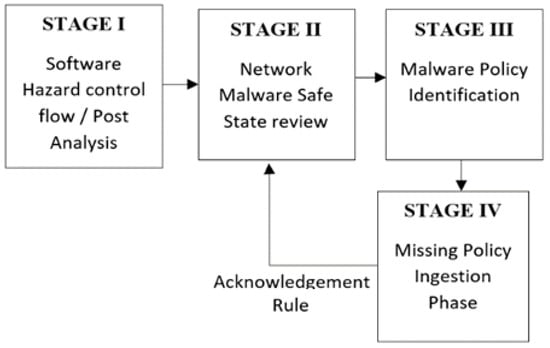 Our hybrid IDS Control Flow method associates malware traces, by mapping malicious data with benign data, to either existing in-network machines or external to the current network []. STAGE I primes the ingestion for software hazards control flow issues, in Figure 4. STAGE II-tier networked malware identification compares safe state activities. STAGE III is the malware detection phase, and STAGE VI acts as a missing policy information ingestion stage for GAN model optimization.