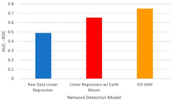 Next, we plotted the AUC-ROC values in Figure 8 and compared the proposed approach with the approaches such as linear regression with raw data-based and linear regression with earth mover models [,]. Our approach ICF-GAN results in the highest AUC-ROC and outperforms the existing method raw data linear regression and linear regression with earth mover []. The lower AUC below 0.5 suggests that the model test has limited discriminatory ability, seen in the raw data linear regression model. The linear regression with the earth mover model gives higher AUC than the raw data linear regression model but is lower than our proposed model. The proposed ICF-GAN results in the highest AUC among all three as we consider LSTM based minibatch processing.