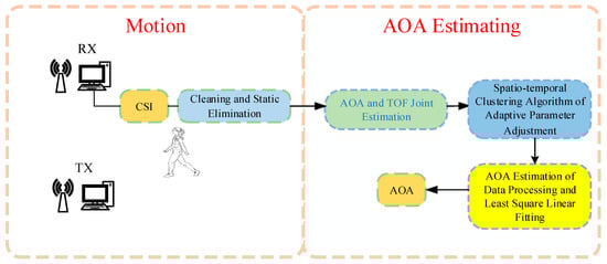 In the following subsections, the proposed algorithm is elaborated. It includes CSI model building, phase calibration, static path elimination, and the angle estimation algorithm jointly with AOA and TOF, the spatiotemporal clustering algorithm, and the least-squares linear fitting shown in Figure 1.