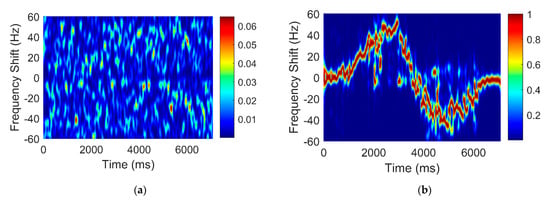 (a) Measured time-frequency chart without static elimination; (b) Measured time-frequency chart with static elimination.