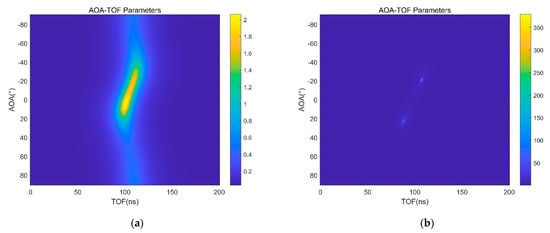 (a) AOA and TOF are estimated by MUSIC algorithm; (b) AOA and TOF are estimated by MNM algorithm.