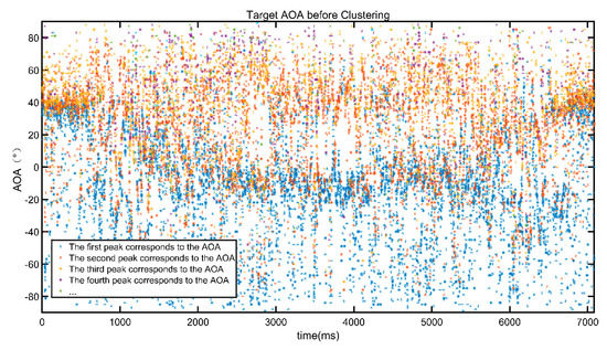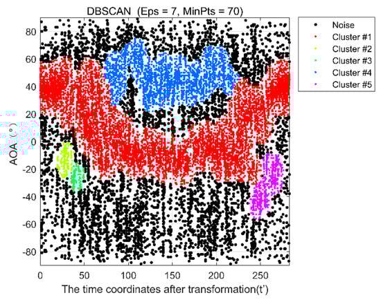 Figure 5 shows that it is difficult to find the angle information of the moving target from the MNM algorithm. Meanwhile, DBscan is a density clustering algorithm. It does not need to specify the center of the cluster and the number of clusters. Since the angle information changes continuously in the adjacent time, we cluster the angle information together with the time information.