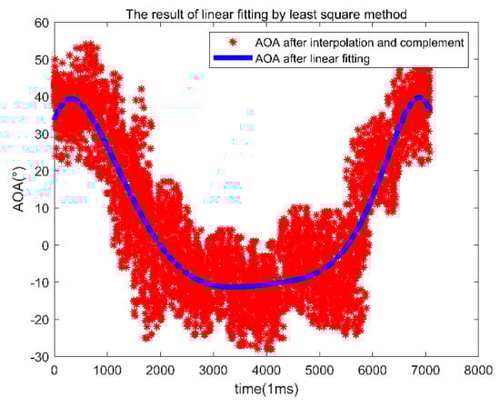 Figure 7 shows the results of polynomial fitting using the least-squares method. The red asterisk is the result of AOA after interpolation. The blue line is the polynomial linear fitting results of the least-squares method.
