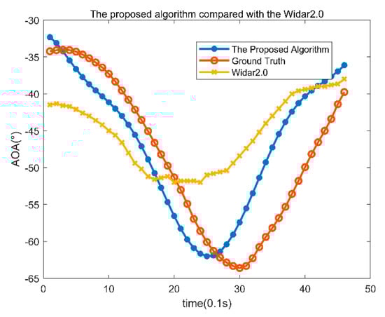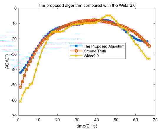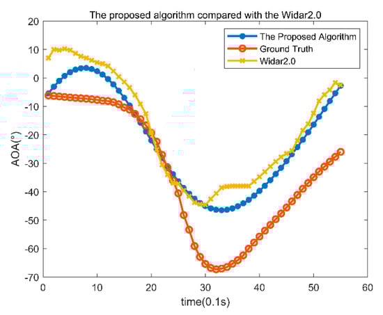 The following are the T01 data obtained in the corridor environment. The trajectory is perpendicular to the cable line of the transmitting and receiving antennas, first, moving away and then coming back. Position estimation is made every 0.1 s. The time of the trajectories is 6.7 s, with 67 angles estimated. There are 67 angles. The angle estimation results are shown in Figure 10, where the red line is the actual angle information. The blue line is the angle estimation result of the proposed algorithm. The yellow line is the angle estimation results of Tsinghua’s Widar2.0. The average angle error of the proposed algorithm is 1.7°, and the average angle error of Widar2.0 is 4.5°. Because the algorithm in this paper is based on temporal and spatial clustering and fully considers the continuity of angle information of the adjacent time, the average error of the proposed algorithm is relatively small, and the accuracy is relatively high.