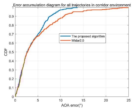 The data with only one trajectory may not be so complete. We ran all data for the three environments of the classroom, office, and corridor, respectively. The cumulative angle error of the corridor is shown in Figure 11. In Figure 11, the blue line is the error accumulation of the proposed algorithm, and the red line is the error accumulation curve of Tsinghua Widar2.0. It can be seen from the figure that 90% of the angle error of the proposed algorithm in this paper is less than 7.74°, and 90% of the angle error of the Tsinghua Widar2.0 algorithm is less than 10.72°. The algorithm in this paper is slightly better than the latter.