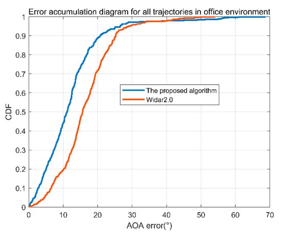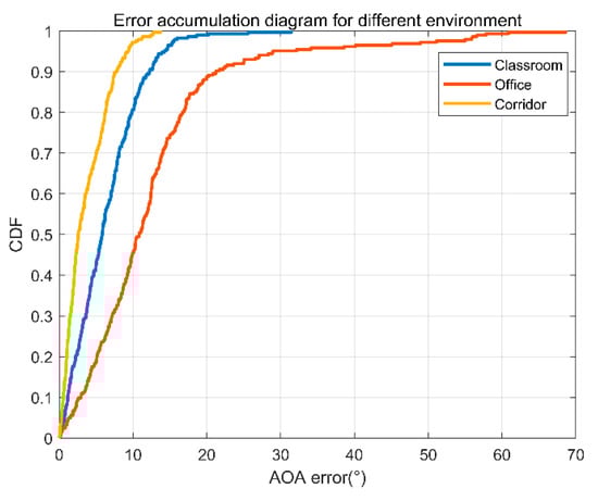 As known, indoors is a typical multipath environment. Multipath information will affect the accuracy of our parameter estimation. In this experiment, we analyzed the errors of the three test environments, respectively. Figure 14 is the error accumulation function for the three environments. From the figure, we can find that the average error of AOA in the corridor environment is the smallest. Because there is no furniture in the corridor, the multipath interference is less, and the result is relatively more accurate. In the office environment, there are sofas, tea tables, drinking fountains, and storage cabinets. They will cause more severe multipath and relatively larger errors. In the classroom environment, only desks are placed beside the wall. The degree of multipath effects lies in between that with the corridor and that with the office, and so do the errors.