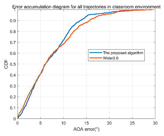 We ran the data for all the tracks in the classroom environment. The angle error accumulation diagram is shown in Figure 13. In Figure 13, the blue line is the error accumulation curve of the algorithm in this paper, and the red line is the error accumulation curve of Widar2.0. It can be seen from the figure that 90% of the angle error of the algorithm in this paper is less than 13.68°, and 90% of the angle error of the Tsinghua Widar2.0 algorithm is less than 15.83°. The algorithm in this paper is slightly better than the latter.