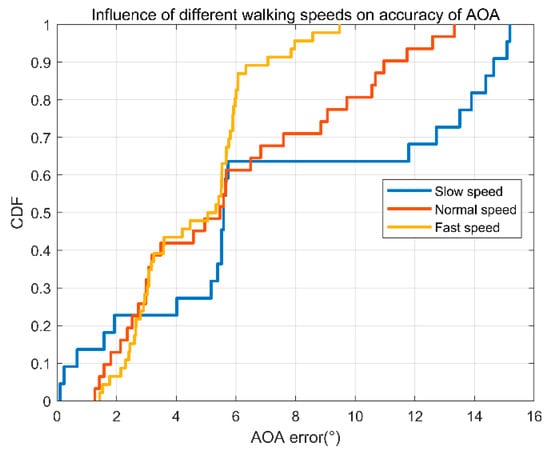 In order to understand the impact of walking speed on the system performance, we conduct the following experiments. The errors of AOA are analyzed under three different conditions of the target: relatively slow walking speed, normal walking speed, and fast walking speed. The results are shown in Figure 15. As we can see, the error is relatively large when the target walks slowly. This is because we apply the static path elimination beforehand. When the target walks slowly, part of useful information will be eliminated, so the error is large. On the other hand, when the target walks faster, less useful information is eliminated, and the error is smaller.