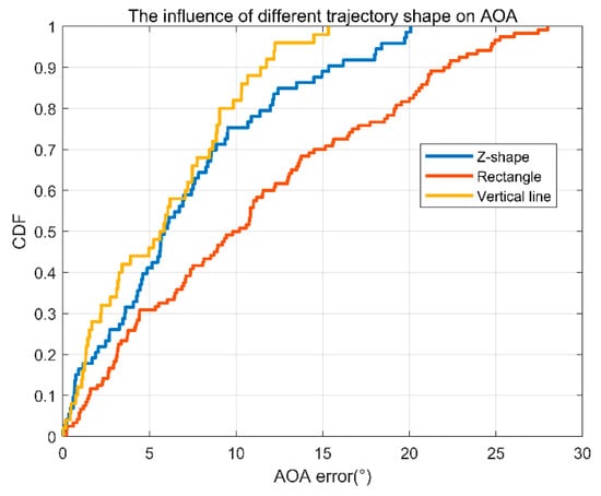 Will different trajectories affect the estimation of AOA? For this reason, we compared the errors under three different trajectory shapes: z-shaped route, rectangular close loop, and vertical line. As can be seen from Figure 17, the overall error of the vertical line is the smallest. This is because when you go straight, the angle information is more continuous, and the result is more accurate. For the rectangular loop, there is a significant angle change at the turning corners, so the error is the largest. For the z-shape route, the error lies in between that with the rectangular and the vertical.