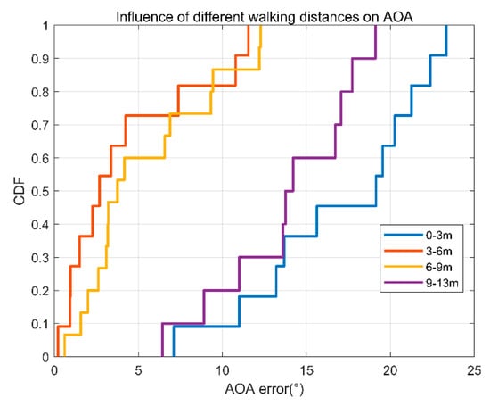 Does the length of the walk distances affect the angle estimation? We conduct the following experiment to analyze the errors under different walking distances. As shown in Figure 19, distance has no impact on angle estimation. Since the speed is relatively low at the beginning and end of the walk, the error between distances of 0–3 m and 9–13 m is large, which is consistent with the previous analysis.