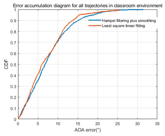 In this paper, two methods are used to compare the final processing of AOA: one is the least-squares linear fitting, the other is the multiple uses of Hampel and smooth filtering. The result is shown in Figure 20. The linear fitting can fit the original results to the maximum extent. The smoothing and Hampel can smooth out the places where the angle changes dramatically, resulting in the loss of details. Therefore, the linear fitting method is more accurate.