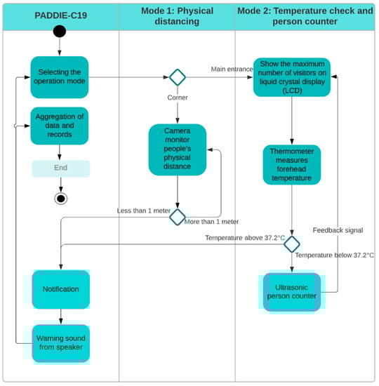Figure 1 illustrates the flow of PADDIE-C19 operations at the edge, where computation and data storage are located closer to the primary user. PADDIE-C19 operates in two modes: (i) physical distancing monitoring, and (ii) temperature measurement with a person counter. PADDIE-C19 will be in the first mode if installed at the viewpoint corner. Grove AI HAT equipped with an RGB camera is used to monitor physical distancing compliance. A loudspeaker will deliver a warning sound when individuals fail to maintain a physical distance of at least one meter. After that, in the second mode of operation, the infrared thermometer will take the forehead temperature of each individual without making contact before allowing them to enter the building or enclosed area. Simultaneously, the ultrasonic sensor will detect anyone passing through the main door. The Raspberry Pi will be responsible for recording and processing temperature data and people counter data. Following that, both measured values will be displayed on the LCD, along with the maximum number of people permitted in a room or area.