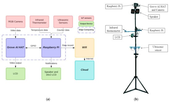 The PADDIE-C19 prototype is illustrated in Figure 2b. A 2 megapixels OV2640 RGB camera is used to provide video data to Grove AI HAT, the edge computing unit for people tracking and physical distance monitoring. An LCD with a resolution of 320 × 240 is used to display the detection results while running the program. The OV2640 camera and LCD connect to the Grove AI HAT via a 24-pin connector with a serial communication protocol. Two ultrasonic and one infrared sensor are connected to the Raspberry Pi microcontroller. A speaker is connected to the analog audio output of the Raspberry Pi to provide warning sound if there are individuals who do not comply with the physical distance rules. The Grove AI HAT and Raspberry Pi can be powered by a 5 V/2 A power adapter via a USB connector. The Raspberry Pi is connected to the internet and eventually the cloud via Wi-Fi, and can be remotely controlled via the VNC Connect software. The PADDIE-C19 design concept is based on the installation at indoor public locations such as shops, offices, and factories. All the connections can be referred to in Figure 2a.