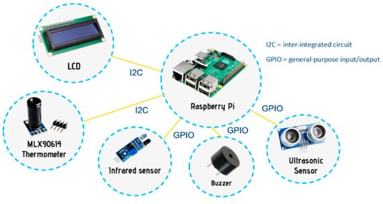 Figure 3 shows the setup of Raspberry Pi with an MLX90641 infrared thermometer used to measure forehead temperature whenever a user places his head in front of it. The forehead distance from the infrared thermometer can be calculated using an infrared sensor. This is due to the fact that each type of thermometer has a unique distance-to-spot ratio. As a result, temperature taking is permitted only at a distance of 3 to 5 cm for the MLX90614 thermometer to obtain an accurate forehead temperature reading. The infrared camera connects to the Raspberry Pi via the I2C protocol. The buzzer will emit a signal sound when the temperature is successfully measured. Furthermore, two ultrasonic sensors were used to detect people moving in and out of the premises from a distance. If the first sensor detects the obstacle ahead of time, the number of people recorded will be increased by one. The recorded number of people will be reduced by one if the second sensor detects the obstacle ahead of time. Algorithm 1 describes the physical distancing monitoring system that consists of two functions.