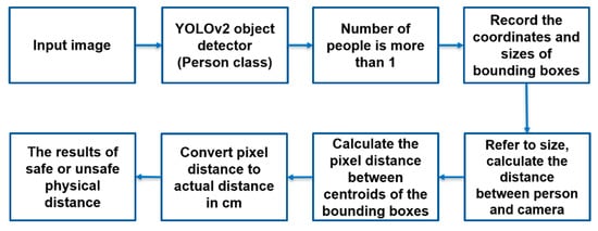 The YOLOv2-based person detection model was used to detect people from images captured from the OV2640 camera. Next, the KPU Grove AI HAT obtains the information of the people’s sizes and coordinates detected in the bounding boxes. The distance between two detected persons was then calculated according to the centroid of the bounding boxes. The estimated physical distance between individuals was determined using the pixel distance on the LCD. Equation (1) shows the distance formula, with d used to find the pixel distance between two coordinates of the centroid using Pythagoras’ theorem. If the bounding box fails to keep a minimum distance of one meter from the others, it will turn red.