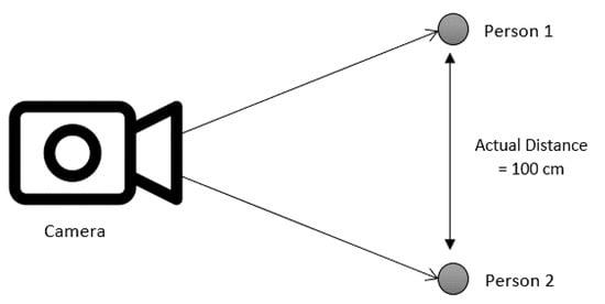 With reference to [22] and Figure 5, the actual distance in centimeters can be calculated according to how many pixels have been used in 1 m with a directly proportional formula, k, as shown in Equation (2). While it is obvious that the rate of change of pixel distance is directly proportional to the actual distance, this method requires calibration according to a fixed camera distance. To improve the accuracy of distance determination, three constant values must be determined with an actual distance of 100 cm between two people using three tests at camera distances of 200 cm, 300 cm, and 400 cm. Since the camera is installed at a fixed location to detect a small area of people, the distance between the camera and people is considered constant. Multiple PADDIE-C19 devices can be arranged in multiple places to cover a larger crowd for detection
