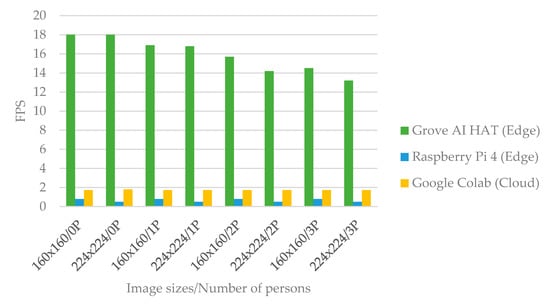 The object detection model is evaluated in terms of FPS to determine how fast the video is processed in Grove AI HAT to detect the object of interest. The central processor unit (CPU) is a significant contribution to frame rate. To examine the differences between edge computing and cloud computing, a YOLOv2-based person detection model was run on Grove AI HAT, and a YOLOv4-based person detection model was run on Raspberry Pi and Google Colab. Due to hardware and software limitations, the YOLOv4 model could not be run on the Grove AI HAT because the kmodel detection model is dedicated for use with the KPU Grove AI HAT. Figure 6 depicts the change of FPS between the three platforms based on the size of the input image and the number of people. Grove AI HAT achieves a maximum FPS of 18 FPS on the LCD, but begins to degrade as the number of people standing in front of the camera increases. Based on the same image size input, Google Colab and Raspberry Pi cannot achieve more than 2 FPS. Google Colab is GPU-enabled. However, the GPU detection resulted in a considerable live streaming delay due to the limited bandwidth of the chosen networks. Finally, the Grove AI HAT on edge outperforms the Raspberry Pi on edge and Google Colab on the cloud in terms of video smoothness.