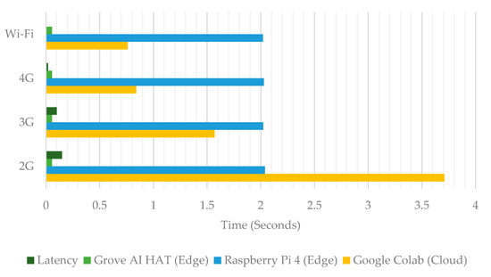 Table 6 displays the evaluation of a Python script’s execution time to complete one iteration in four network conditions. Chrome DevTools was used to define Wi-Fi, 4G, 3G, and 2G internet network profiles to monitor and control network activity. Figure 7 shows that the time spent by Google Colab increases as the Internet speed decreases from the 4G network to the 2G network. However, the execution time of Python scripts on edge computing device terminals remains the same because video data processing services do not rely on the internet. This is due to the fact that Google Colab runs an object detection model in the cloud and its performance and stability are highly dependent on the internet network’s stability and speed. A large amount of internet bandwidth is required to upload video data before the person detection process is carried out in the cloud.