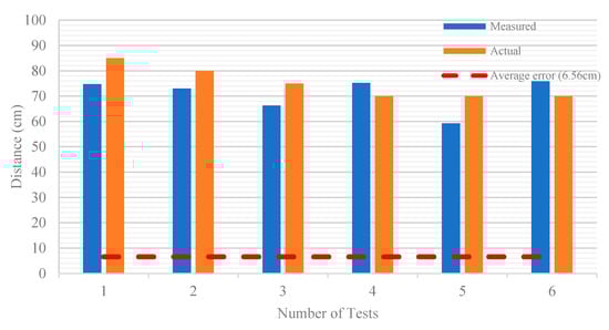 The size and coordinates of the boundary box generated by the KPU Grove AI HAT on the detected person can be used to calculate the physical distance between them. The method of measuring the distance between two people in Grove AI HAT is first to calculate the pixel distance, d between two people in the image using Equation (1) and then convert the distance into centimeter using constant k in Equation (2). Figure 8 shows an example of physical distance measured from the LCD and Table 9 lists the constant k values according to camera distance. Figure 9 summarizes the measured distance from the pixels compared to the actual distance measured from the measuring tape. The average error between the measured and actual values is shown in red dotted line and the mean absolute error (MAE) between them is 8.95 cm. However, the disadvantage of this method is that the detected person’s measurement and height will affect the accuracy of the distance measurement between two people. Additionally, Grove AI HAT operations such as person detection and physical distance monitoring can only be performed from a frontal view. The 224 × 224 image input resolution was insufficient to produce high-quality person detection at a long-range distance. The main limitation is that the KPU Grove AI HAT has a limited memory capacity, making it incapable of handling image input resolutions greater than 224 × 224 from the camera.