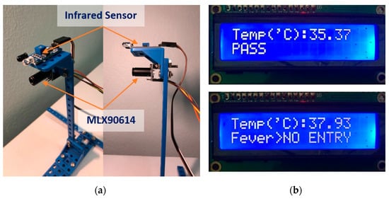 (a) Forehead MLX90614 thermometer prototype and (b) LCD displays either pass or no entry based on detected temperature with a limit of 37 °C.