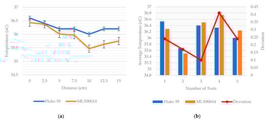 The graph in Figure 11a illustrates the values of forehead temperature obtained from Fluke 59 and MLX90614 at various distances ranging from 0 cm to 15 cm. The temperature value of the MLX90614 thermometer gradually decreases after 5 cm due to the lower distance to spot ratio compared to the Fluke 59 thermometer. According to the product specifications, MLX90614 has a 1.25 distance to spot ratio, whereas Fluke 59 has a value of 8. In addition, the standard deviation value of the MLX90614 is 0.3346, which is higher than the value of 0.1761 for Fluke 59. When the measuring distance exceeds 5 cm, taking the temperature value from MLX90614 becomes less accurate.