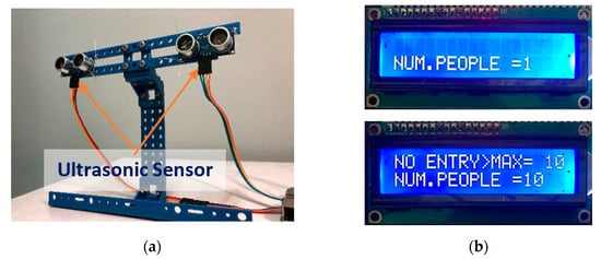 The person counter prototype is shown in Figure 12a, which consists of two ultrasonic sensors to add confidence to the readings. It will be installed at the premises’ main entrance and will count people’s movements bidirectionally. However, the current system limitation is the capability of counting only one person passing through the sensor at a time. The refresh rate of the two ultrasonic sensors in detecting passing people is 9.8 Hz. If someone passes from left to right, the number of people will be added by one on the LCD, while if someone passes from right to left, the number of people will be subtracted by one. If the number exceeds the maximum limit, the LCD will indicate no entry as shown in Figure 12b. Note that the maximum limit can be reconfigured according to the preference of the premise’s requirement.