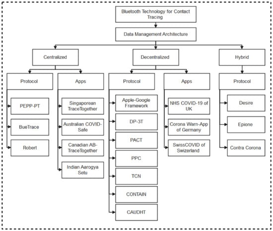 We, therefore, present protocols and applications developed using Bluetooth technology as shown in Figure 2. For clarity purposes, the classification of contact tracing protocols and apps are categorized into the three major data management methods: centralized, decentralized, and hybrid architectures [30].