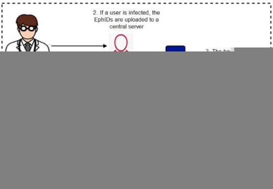 Distributed Privacy-Preserving Proximity Tracing (DP-3T): DP-3T is powered by a group of international professionals, medical, technological, and legal experts whose common objective is to achieve user privacy preservation in contact tracing. It is more of a peer-to-peer contact tracing scheme that eliminated the overbearing control of central servers [36]. In DP-3T as shown in Figure 6, smartphones locally generate and broadcast ephemeral identifiers (EphID) for a given period called epoch which could vary between 10 min to 24 h before a new EphID is generated. Upon diagnosis of a patient, after due authorization by the relevant authority, the user uploads their EphIDs to a trusted backend server. To confirm the status of other users, the protocol is designed in a manner that every user periodically queries the central server to match the locally stored EphIDs with those stored in the backend server. A successful match shows that the user has come in contact with an infected user, hence could be at risk of the infection. There are three versions of the DP-3T protocol which include low-cost, un-linkable, and hybrid versions of this protocol. The low-cost version of the protocol computes and stores the EphIDs which are the hashes of the daily generated seeds [37]. This version disseminates the EphIDs along with the user seeds. The low-cost version is less bandwidth-demanding but is not fully free from user traceability attacks. The un-linkable version on the other hand is more bandwidth-demanding but has more user privacy features. Instead of disseminating the EphIDs along with the user daily seeds, the un-linkable version displays a hash of the seeds which is stored in a cuckoo filter. In this version, the user has the redact capability. This offers the user the flexibility to choose the period or time of the day which he wishes to display the EphIDs of their contacts. Finally, the hybrid design merged some features of both the low-cost and the un-linkable versions. In this version, the bandwidth requirement is lower than as it is in the un-linkable version yet, its privacy feature is higher than that of the low-cost version. In the hybrid version, a seed is generated for a defined window period. Upon infection of a user, only relevant seeds are uploaded.