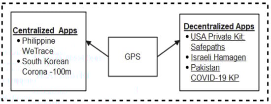 Today, GPS systems are being exploited in many non-military operations such as wireless video processing and monitoring, navigations, surveying, internet services, and location tracking [59]. The GPS can track more than one object and determine their respective distances relative to each other, also taking record of their periods of interactions. This special feature has positioned GPS as a choice technology for contact tracing systems. Moreover, researches have shown that there are many weaknesses inherent in GPS-based systems. First, GPS systems reveal device identity and locations, therefore, are prone to security and privacy-related vulnerabilities. Furthermore, it has been observed that GPS-based systems suffer from poor co-location accuracy, high battery consumption and are not suitable for indoor applications [60,61,62]. Despite these weaknesses of GPS-based systems, there are some Apps developed leveraging GPS technology in the fight against the coronavirus. We briefly discuss these apps classifying them into two: centralized and decentralized apps as shown in Figure 8.