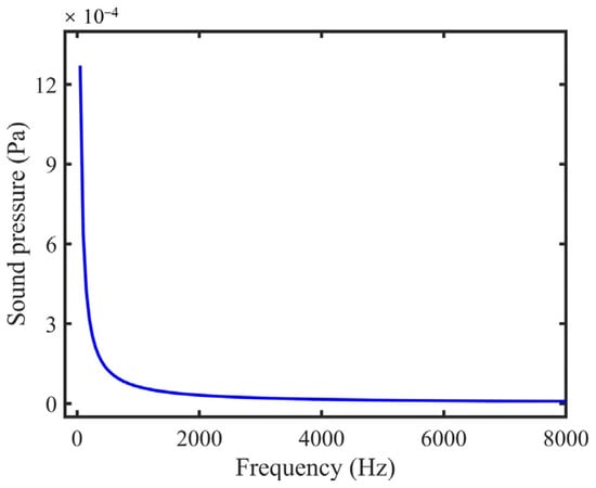 Due to the characteristics of the integrating sphere, the light field in the sphere was uniform. The uniform light field produced homogeneous heat in the device. The sound pressure at any point on the inner surface of the sphere was simulated. A sphere with a diameter of 5.08 cm was set as a uniform heat source with a value of 1 W/m3. As shown in Figure 1, the sound pressure was inversely proportional to the modulated frequency, which is consistent with Equation (6). Therefore, there was no resonance in the sphere.