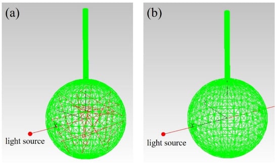 For the sake of combining long optical path and acoustic resonance, a tube was connected to the integrating sphere. As an example, the length and diameter of the tube were 5 cm and 4 mm, respectively. To reduce the noise caused by the reflection of light beams in the tube, the inner wall of the tube was blackened. The light field distribution was also simulated. A collimated light beam was reflected multiple times in STPAC, as shown in Figure 2a. When the light beam passed through the sphere, it was similar to TPAC, as shown in Figure 2b. In fact, the light inlet, light outlet, air inlet, and outlet could not reflect the light beam. However, when the opening of the sphere was less than 5% of the inner surface area of the integrating sphere, the influence of the diffuse reflection effect could be ignored [51], and was not considered in the simulation. Only the light beam in which the laser energy is greater than 90% of the initial energy is shown in Figure 2a.