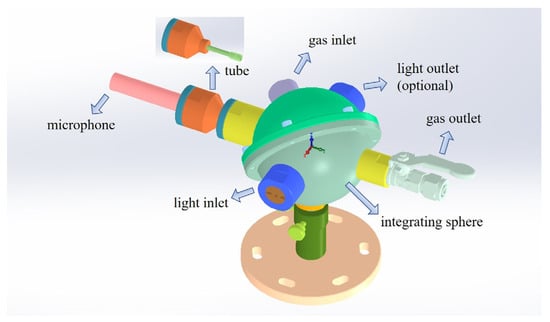 The 3-D model of STPAC is shown in Figure 4, and is mainly composed of light inlet, light outlet (optional), gas inlet, gas outlet, acoustic resonance tube and integrating sphere. The light outlet could be configured into ‘open’ or ‘closed’ modes, so that the PA cell could be flexibly converted between STPAC and TPAC. Due to the threaded structure of the joint, the PAC was conveniently coupled with different length tubes.