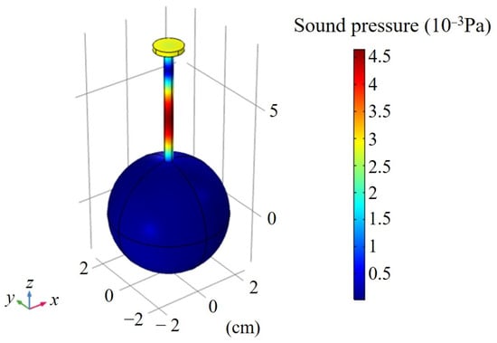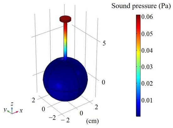 The resonance frequency is the natural frequency of the photoacoustic cell, which is independent of the excitation mode of the light beam. Therefore, a sphere of 5.08 cm in diameter was set as a uniform heat source with a value of 1 W/m3. When the tube length was 5 cm, the sound pressure distribution of STPAC in the first-order longitudinal resonance mode was as shown in Figure 6. The resonance frequency was 1238 Hz, and the maximum sound pressure was located at the end of the tube connected to the microphone. At the same time, the sound pressure in the integrating sphere was close to zero.