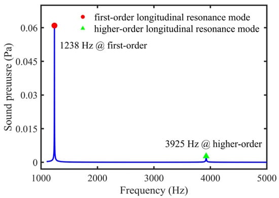 With an increase of frequency, the second-order longitudinal resonance mode had a resonance frequency of 3925 Hz in the tube, as shown in Figure 7. The variation curve of sound pressure at the end of the tube with frequency is shown in Figure 8. When the resonance order was raised, the sound pressure at the end of the tube decreased. Therefore, the tubes described in this paper worked in the first-order longitudinal resonance mode to produce maximum sound pressure.