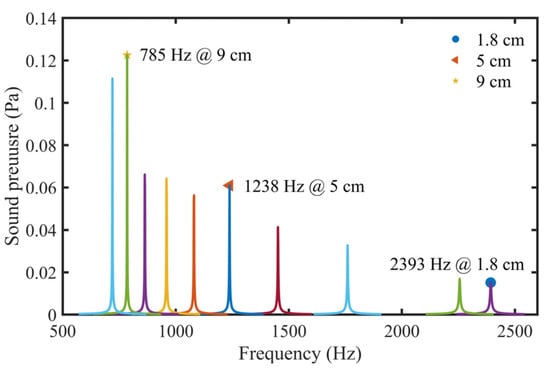 Simulated sound pressure curves of STPAC with different tube lengths. Tube lengths from left to right were 10 cm, 9 cm, 8 cm, 7 cm, 6 cm, 5 cm, 4 cm, 3 cm, 2 cm, and 1.8 cm, respectively.