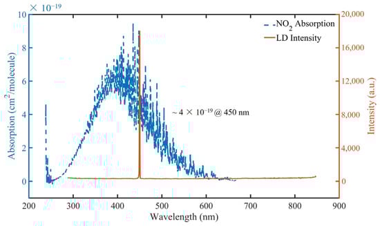 Nitrogen dioxide (NO2) is a trace gas toxic to living beings, which is mainly discharged into the atmosphere by combustion and other processes [1,2]. The average concentration of NO2 in the atmosphere is usually 5–30 ppb, but the concentration is several orders of magnitude higher near the NO2 release source [3]. Due to the influence of sunlight, NO2 decomposes into NO and oxygen free radicals, resulting in an increase of O3 in the air [4]. NO2 has a strong absorption line in the visible region, and absorption intensity is the largest in the blue-violet range [5,6]. However, when the wavelength is lower than 415 nm, NO2 undergoes photolysis [7,8]. With the development of laser diode (LD) manufacturing technology, a low-cost blue LD with a central wavelength of 450 nm has become a suitable light source for the detection of NO2 by absorption spectroscopy.
