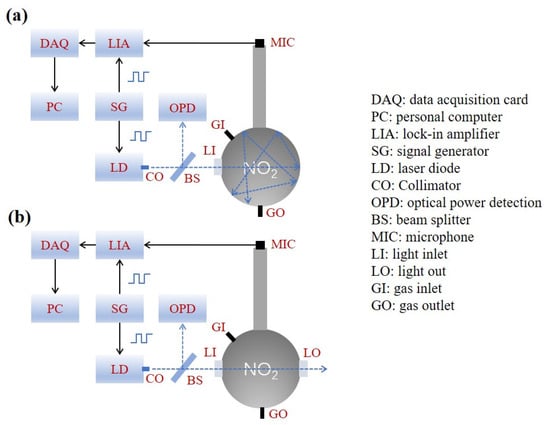 The laser entered STPAC through the optical window. The NO2 samples were commercial standard gases composed of different concentrations of NO2 and N2. To replace the gas in the STPAC, a flow rate of 1 L/min was employed. After the gas replacement was complete, the gas inlet valve and gas outlet valve were closed. To reduce the noise caused by gas movement, the PA experiments were carried out after 10 s. A signal generator was used to provide a signal for intensity modulation of LD. To detect PA signals, a microphone (MPA201, BSWA) with a sensitivity of 50 mV/Pa was installed at the end of the tube. The PA signals were demodulated by a lock-in amplifier, and the integration time was set to 1 s. The demodulated signals were collected by the data acquisition card and uploaded to a computer for analysis. The schematic diagrams of the setup are shown in Figure 11.