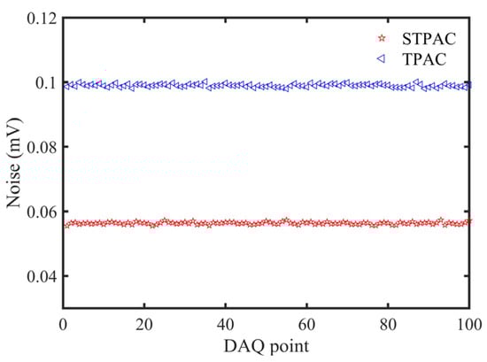STPAC was compared with TPAC to verify the ability of amplifying PA signals. The noise distribution is shown in Figure 14. The average noise value and standard deviation of STPAC were both lower than TPAC, and the performance parameters are shown in Table 4. The SNR of STPAC was ~16 times that of TPAC.