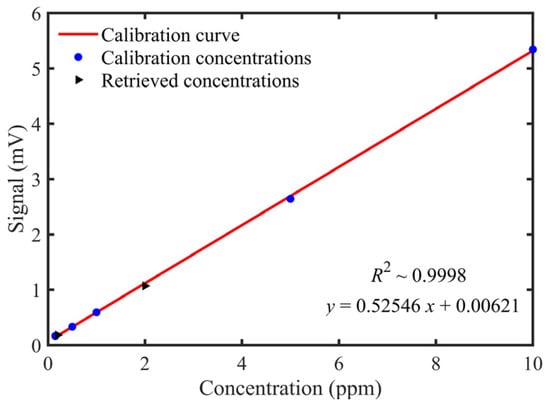 A series of commercial standard NO2/N2 samples with concentrations of 0.15, 0.5, 1, 5 and 10 ppm were used to calibrate the PA gas detection setup based on STPAC. The fitted concentration-signal curve was , and R2 was ~0.9998. The accuracy of the setup was verified by using 0.25 ppm and 2 ppm commercial standard NO2/N2 samples. The related errors between the retrieved concentrations (0.26 ppm and 0.91 ppm) by setup and the actual concentrations (0.25 ppm and 2 ppm) were 4% and −4.5% respectively, as shown in Table 5 and Figure 15. The experimental results showed that the response capacity of the setup was 0.52546 mV/ppm for 0–10 ppm NO2. The minimum detection limit (noise equivalent concentration, NEC) of NO2 was ~0.7 ppb calculated by using 1 time .