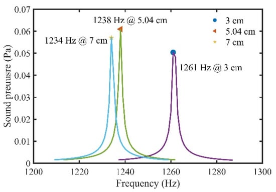 To analyze the influence of different tube lengths on the photoacoustic signal, sound pressure curves of STPAC with different tube lengths were simulated, as shown in Figure 9. The sound pressure of the 9 cm tube was the largest. Sound pressures of 5 cm, 6 cm, 7 cm, and 8 cm tubes were 0.0610 Pa, 0.0563 Pa, 0.0642 Pa and 0.0661 Pa, respectively. So, the sound pressure of the 5 cm tube was 108, 95 and 92% of the other three tubes. However, the resonance frequency was higher, and the volume was smaller. Meanwhile, 1.8 cm was the shortest tube that could be installed in the photoacoustic cell. Therefore, 1.8 cm, 5 cm and 9 cm acoustic resonance tubes were processed for subsequent experiments.