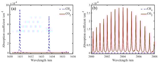 Simulated absorption lines of CH4 and CO2 near (a) 1653 nm and (b) 2004 nm.