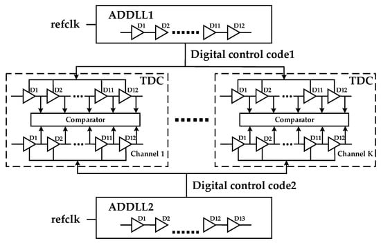 Generally, the goals of a DLL design we need to meet include a wide-operating frequency range, low jitter, fast locking, low power, and process immunity. Conventionally, analog DLLs can perform better in terms of jitter and skew, but they need a long locking time and large chip area, and they are sensitive to PVT variations, which makes them hard to migrate to advanced technologies. Compared with analog DLLs, all-digital DLL is a better choice because of its advantages of fast locking time, easy migration, high power efficiency, and effective tolerance of PVT variations. Furthermore, ADDLL can be better applied to multi-channel TDC because it only requires digital codes rather than analog voltage signals to control the delay line, which allows achieving better consistency between TDC channels. Based on the above merits, when we tried to apply DLL to Multi-channel Vernier TDC, ADDLL is preferred. The diagram of applying ADDLL to Multi-channel Vernier TDC is shown in Figure 1.
