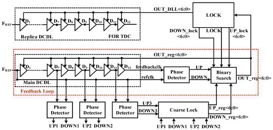 Figure 2 shows the architecture of the whole ADDLL, which comprises five major parts: digitally-controlled delay line (DCDL), a phase detector (PD), binary search module, coarse lock module, and lock module. Among them, the main DCDL, PD, and binary search modules form a closed feedback loop to track the PVT variations. Notice that the entire DLL includes two delay lines: the main delay line and the replica delay line. The overall operating mechanism is that the main delay line is constantly searching to track delay variations caused by the external environment, while the replica delay line is applied to TDC maintain in a stable state. The digital code OUT_reg<6:0> is used to control the delay of the main delay line, and OUT_DLL<6:0> is used to control the delay of the replica delay line.