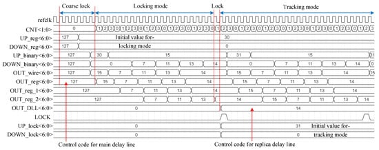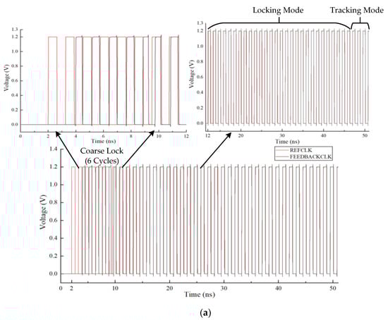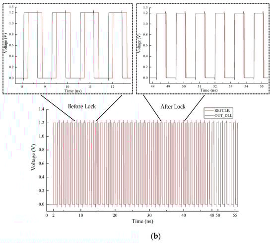 Figure 17a shows the locking process of the main delay line at 800 MHz, while Figure 17b shows the state of the replica delay line, and the corresponding cycles for locking were 37. After power-on, because the delay line had not output a valid clock signal in the first clock cycle, the comparison result of the phase detector was not sampled, and then the normal operation of the circuit started from the second clock cycle. First, it performed the coarse lock to roughly estimate the delay time, thus adjusting the delay to the vicinity of the reference clock. It not only reduced the range that needed to be searched in the subsequent lock process but also avoided the occurrence of harmonic lock issues. The coarse lock consumed six clock cycles. Then it entered the binary search process with locking mode. Since each search process took four reference clock cycles, the 7-bit output code OUT_reg<6:0>, which was applied to the main delay line, changed at every four reference clock cycles. For different reference clocks, the locking situation of coarse lock may be diverse. Therefore, there a slight difference in searching range in the subsequent binary search might occur. For different searching ranges, five to seven search operations might be required, that is, 20 to 28 clock cycles, to reach the locked state. Then, a clock cycle might be required to determine whether the locked state has been reached. Finally, it took one clock cycle for the replica delay line to keep stable with a new control code OUT_DLL<6:0>.