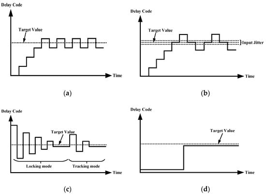 The proposed modified binary search can suppress the dithering phenomenon effectively, as shown in Figure 4 A comparison has been made on the dithering phenomenon between counter-based DLL and proposed DLL. Figure 4a shows the dithering process of the counter-based DLL and its target delay of the DCDL, while Figure 4b depicts the worst case with a small jitter in the clock source considered. As shown in Figure 4c,d, after the first locking of DLL, the main DCDL works in tracking mode to track PVT variations, while the replica DCDL remains stable which means the dithering phenomenon is eliminated. This will significantly reduce the peak-to-peak jitter.